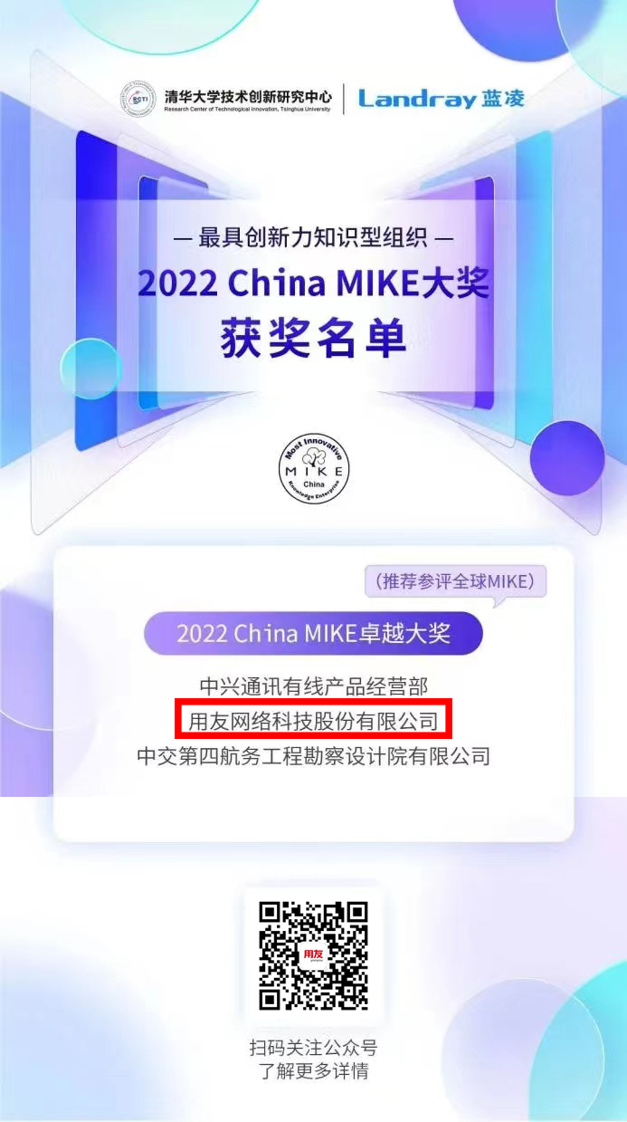 2022年8月,中山用友以极具前瞻性的知识管理理念与卓著的知识创新成果,从近百家企业中脱颖而出,斩获“2022 China MIKE卓越大奖” (中国最具创新力知识型组织),并将被推荐角逐全球MIKE大奖。