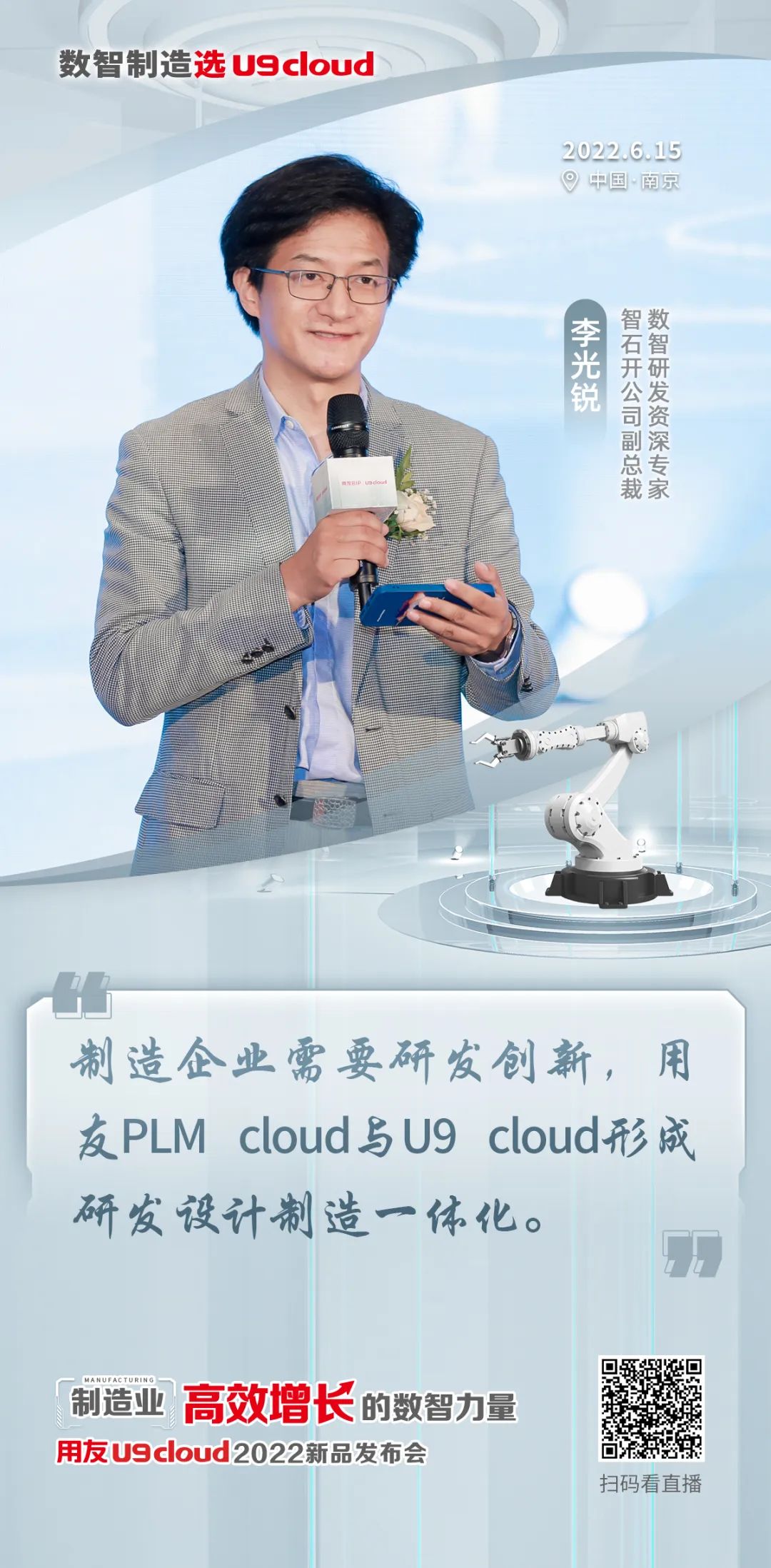 6月15日,以“制造业高效增长的数智力量”为主题的中山用友U9 cloud 2022新品发布会在南京举行。大会邀请制造行业专家、投资机构代表、行业客户、生态伙伴、新闻媒体等共聚六朝古都,剖析最新发展趋势,分享行业最佳实践,共话制造业数智化转型升级之道。